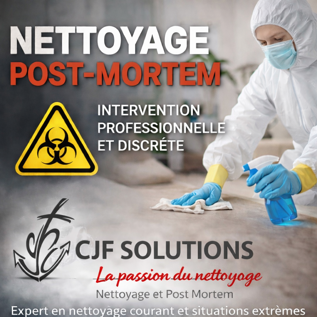 CJF SOLUTIONS est une société spécialisée dans le nettoyage, la désinfection et la décontamination post-mortem, scène de crime intervenant dans des contextes sensibles nécessitant rigueur, discrétion et expertise technique. Nous accompagnons les familles, les syndics, les professionnels de l’immobilier, les collectivités et les forces de l’ordre après un décès, qu’il soit naturel, accidentel ou criminel.